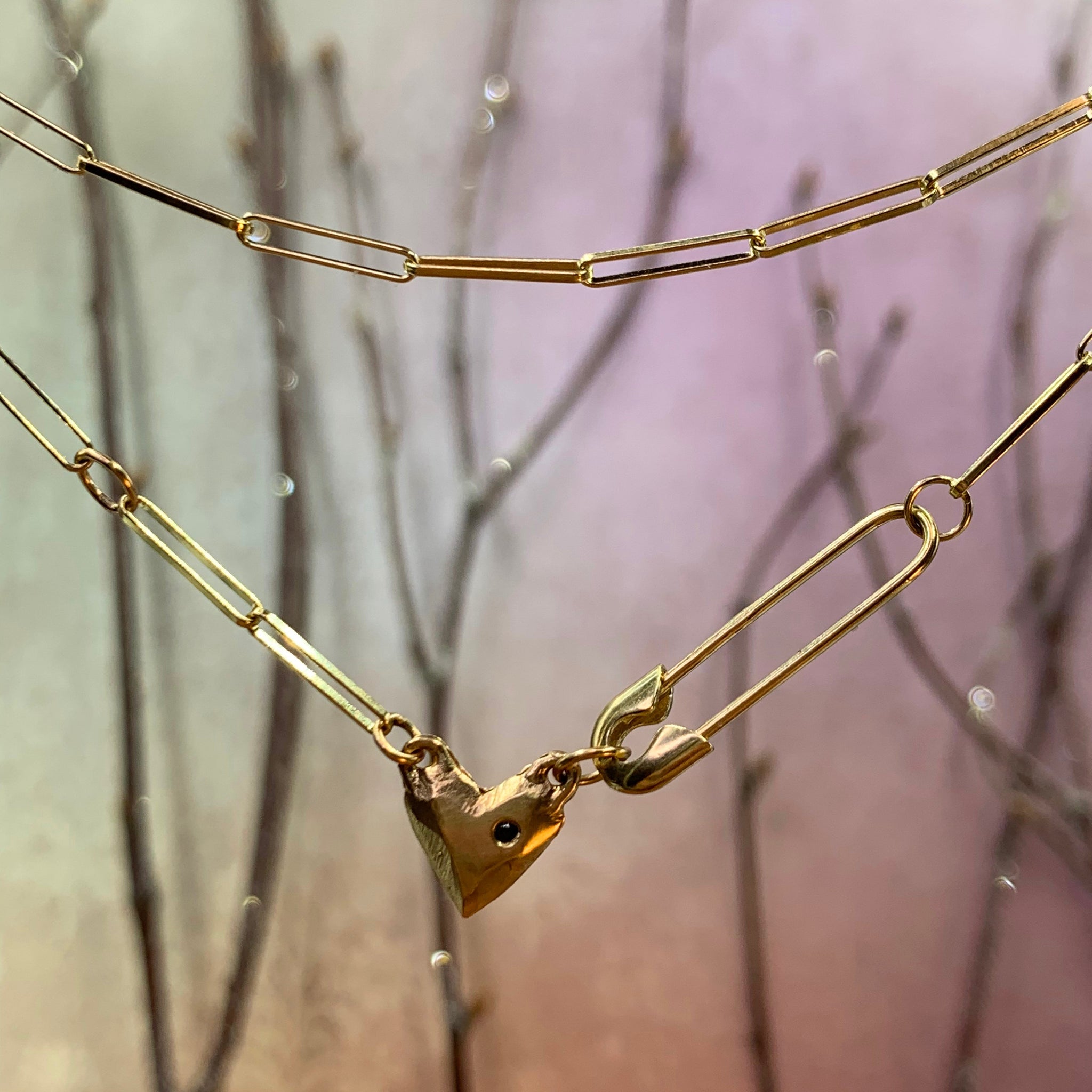 Metal: Heart pendant and safety pin cast in 14k yellow gold with a 14k yellow gold chain